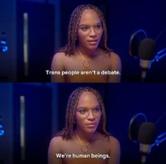 Meanwhile, at her interview, the woman interviewing her asks her about her transness. Elle admits she is very proud to be trans, as it is a big part of who she is. So she likes to explore that side of her in the art she creates. However, when the woman interviewer asks Elle what her opinion on the trans debate is since it is such a hot topic, Elle is initially caught off guard. But quickly recovers and states that trans people aren’t a debate. At the end of the day, they are human beings. Outside the recording booth, Elle’s parents are furious at seeing how uncomfortable their daughter looks. Mariam tells one of the workers how inappropriate this whole situation was, and that it was very manipulative of a radio station to use a teenage girl like this. Tao asks if they should go in and stop the interview, but eventually Elle has had enough and walks out on the verge of crying. As they walk out with their daughter, Mariam warns the radio station they will be hearing from her.