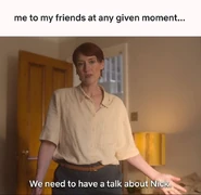 In Menorca, Diane calls Nick a lovesick puppy and jokes that she is diagnosing him with a severe case of smitten, and growing symptoms of head over heels. Eventually, Nick asks his aunt if as a psychiatrist, she treats people with eating disorders. She replies how it is not her specialty but that it tends to go hand in hand with other things, so sometimes she does.